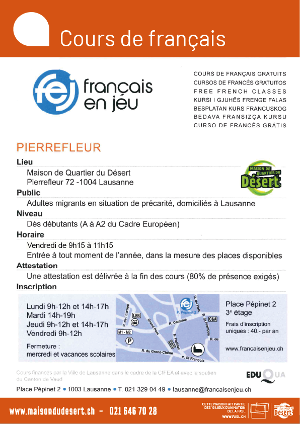La Maison de Quartier est à 1 minute de l'arrêt Désert du bus numéro 2 (Terminus de la ligne) et à 3 minutes de l'arrêt Coudraie des bus 4 et 33. Simplifiez vous la vie et laissez votre voiture au parking!